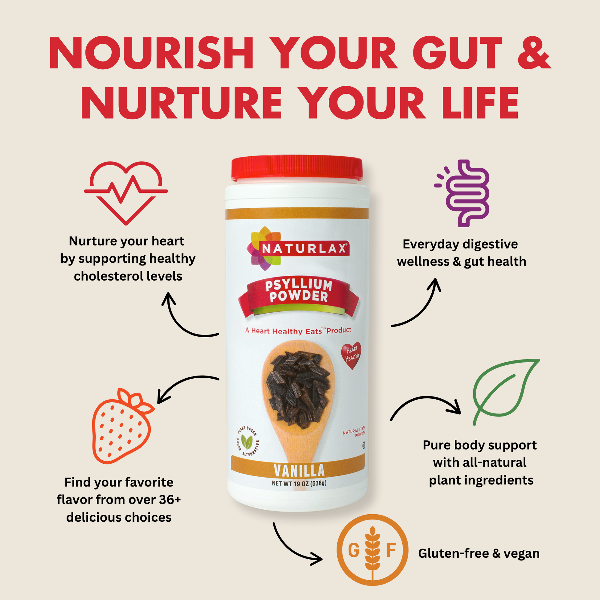 Get Naturlax in 19 oz. containers—perfect for maintaining regular gut wellness. Grab your favorite psyllium husk fiber flavors and enjoy great taste, wellness, and value in every scoop. |